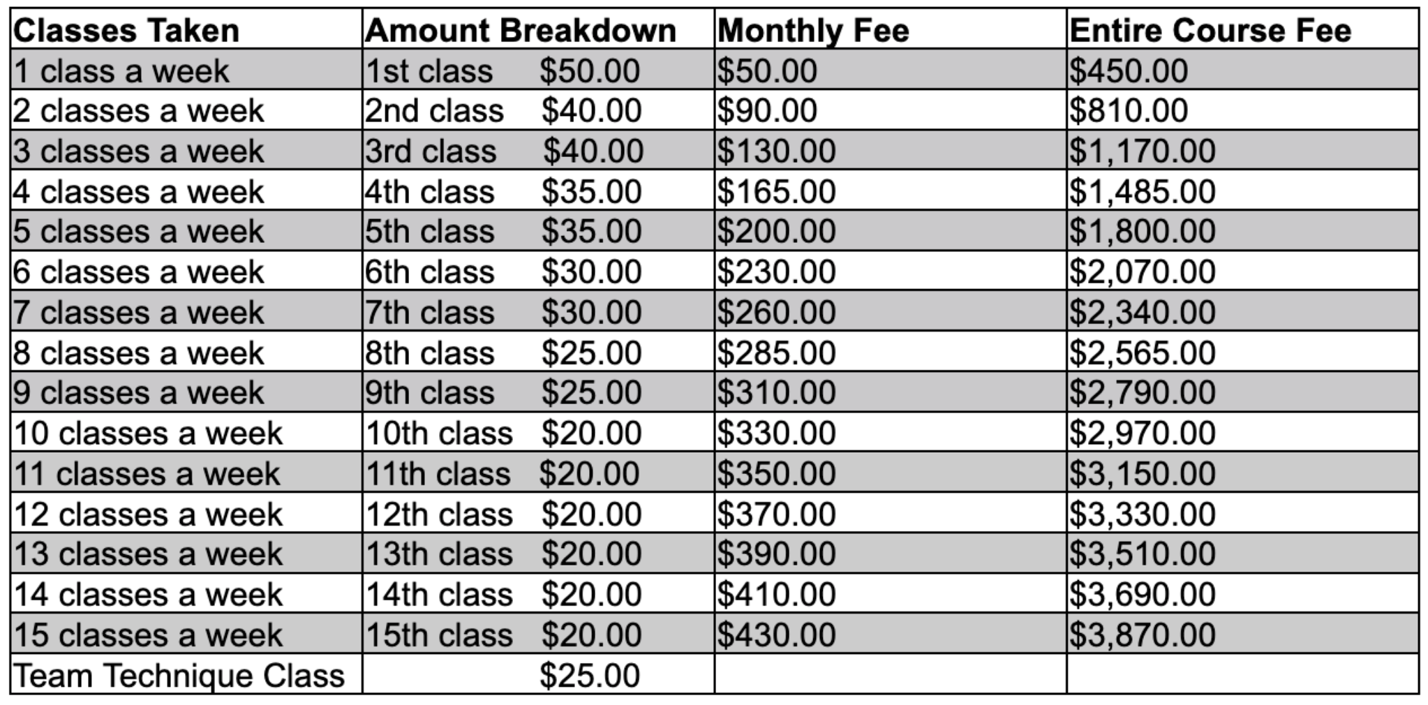 Tuition is based on a Seasonal Course Fee, not calculated per individual class or week. This structure accounts for all scheduled holidays and any closures due to inclement weather.